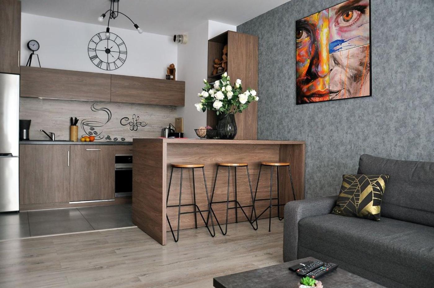 Kuchnia w apartamencie jest w pełni wyposażona, ze stołem oraz wieloma urządzeniami, takimi jak ekspres do kawy ☕, toster, płyta kuchenna, piekarnik, czajnik elektryczny, pralka, zmywarka, kuchenka mikrofalowa i lodówka. Do dyspozycji Gości są również środki czystości, przybory kuchenne oraz aneks kuchenny.