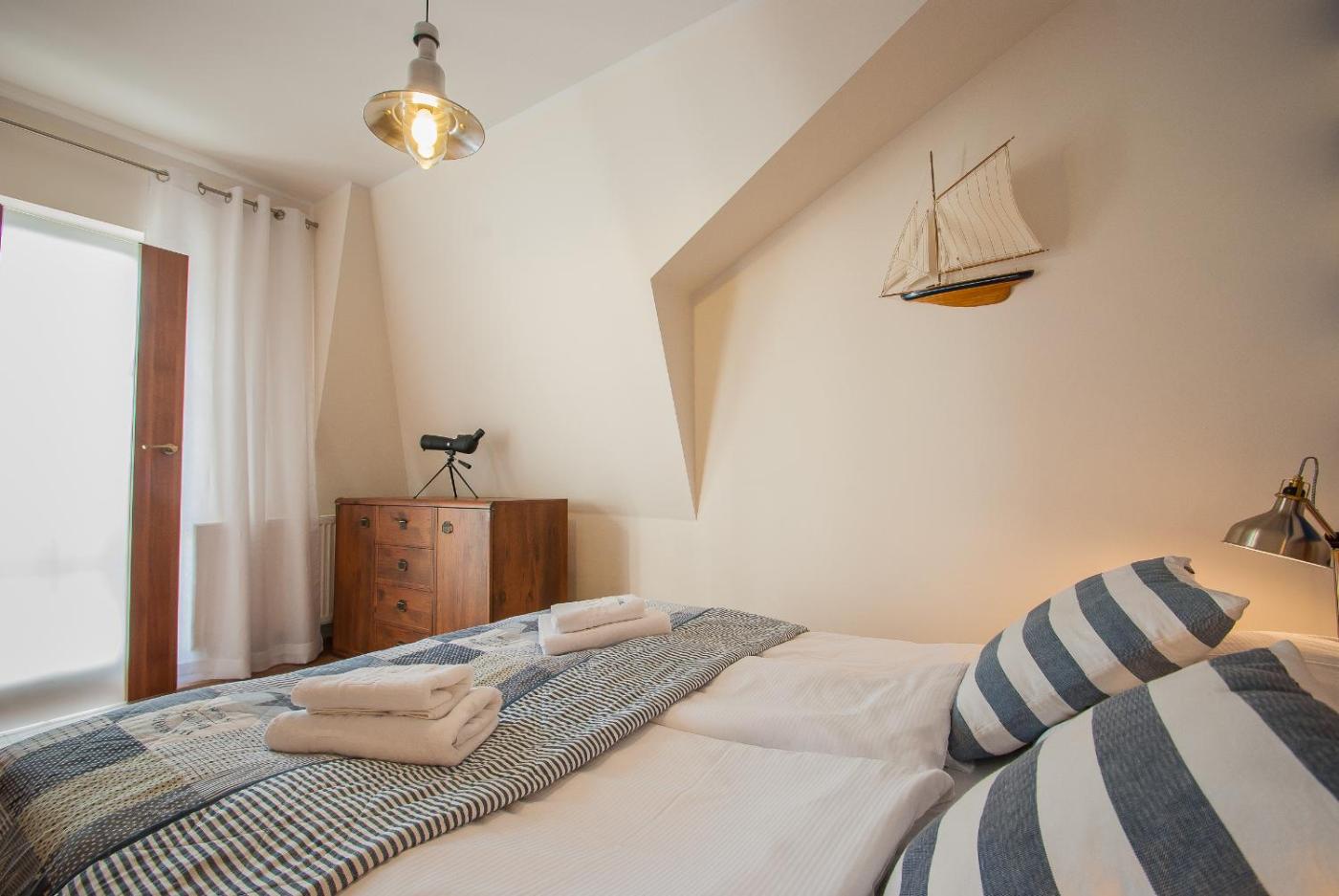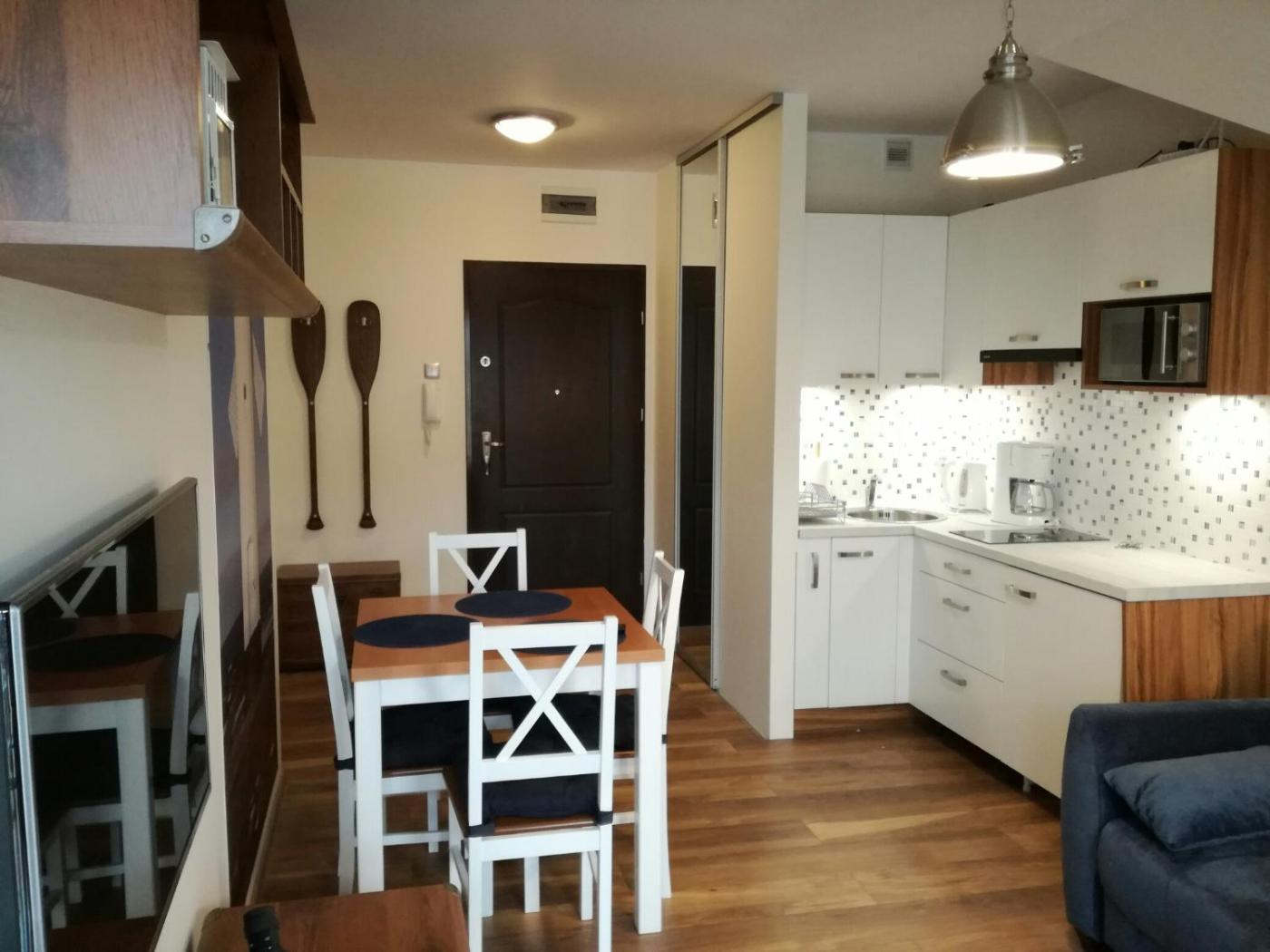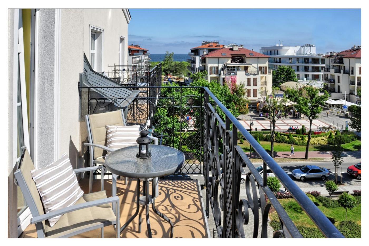 Apartament z widokiem na morze. This apartment offers a sea view, a bedroom, a living room with a kitchenette and a balcony. Apartament - 4 osobowy. Powierzchnia pokoju ok.: 40 mkw.