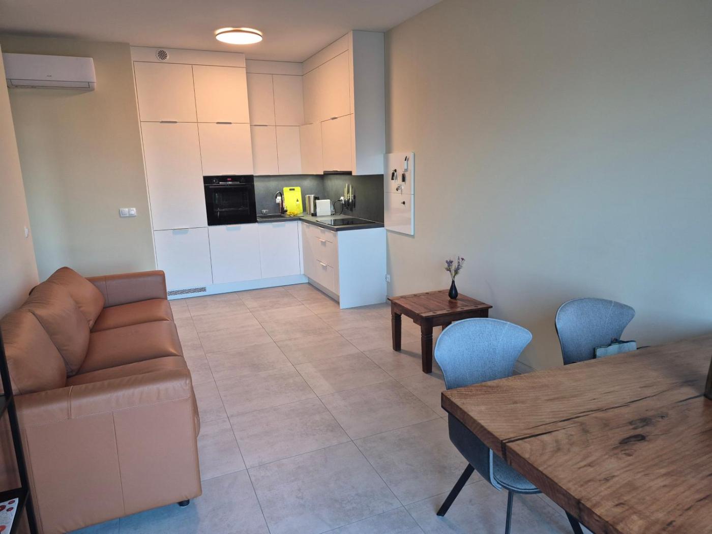Apartament z 1 sypialnią. Guests can make meals in the kitchen that is equipped with a stovetop, a refrigerator, kitchenware and an oven. The apartment provides air conditioning, a washing machine, a private entrance as well as a balcony with city views. The unit offers 2 beds. Apartament - 4 osobowy. Powierzchnia pokoju ok.: 45 mkw.